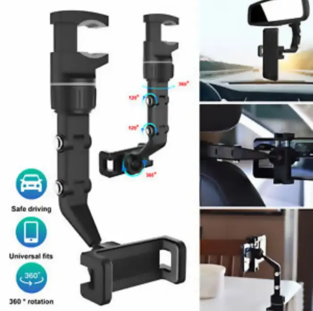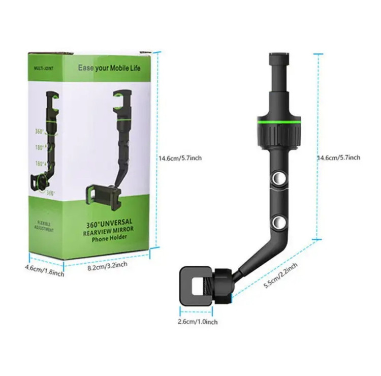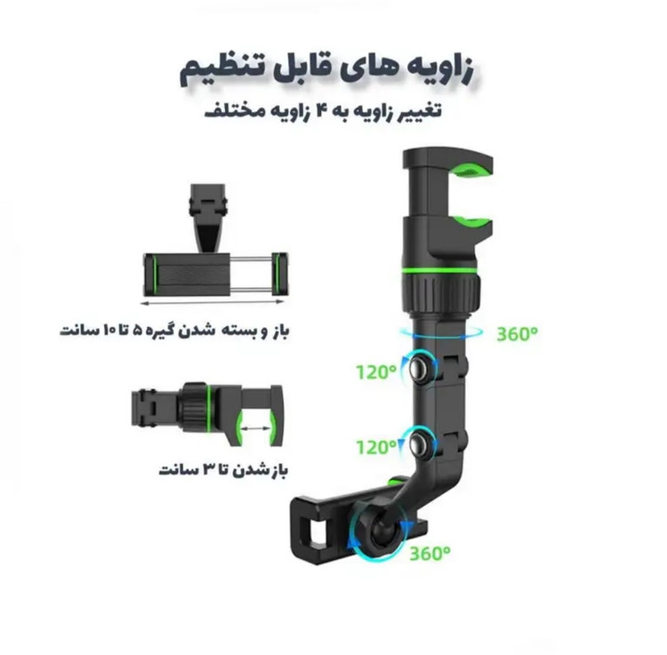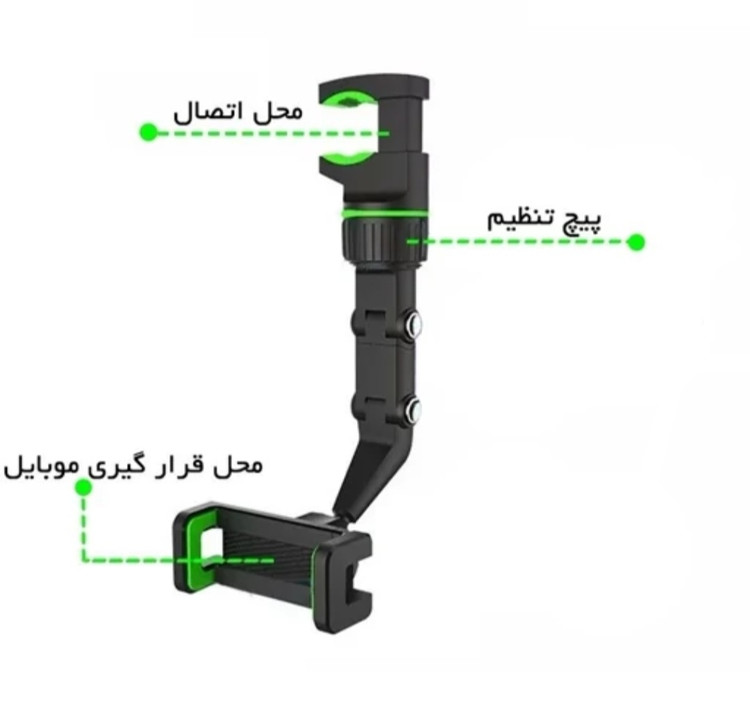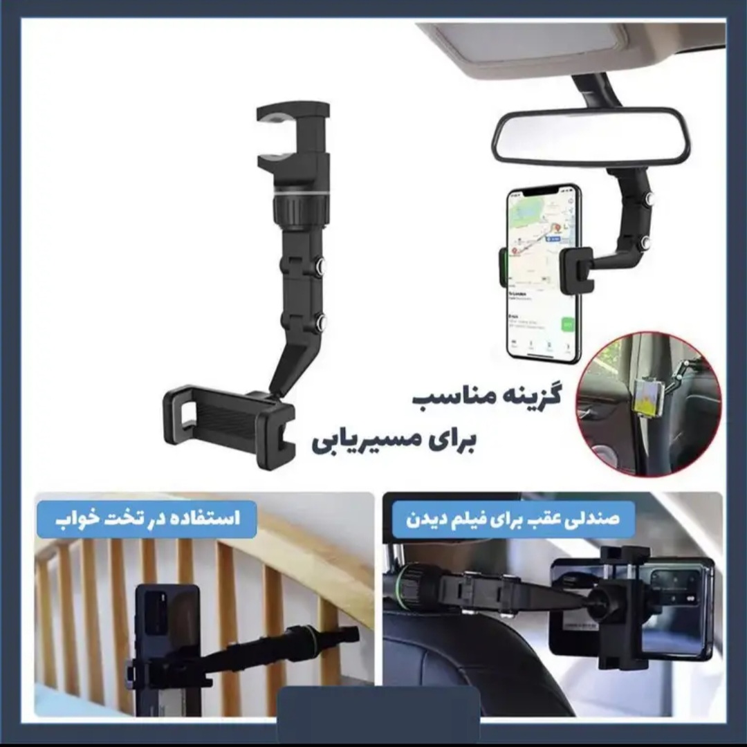 هولدر موبایل آینه ای با قابلیت چرخش 360 درجه ، محصولی جدید و کارآمد برای استفاده داخل خودرو و همچنین محیط های مختلف می باشد . این استند تولید شده از جنس پلاستیک مرغوب و باکیفیت است . بازوی نگهدارنده موبایل آینه ای دارای قابلیت تغییر ارتفاع با استفاده از دو نازل تعبیه شده در قسمت میانی خود می باشد ، کافیست هر یک از نازل ها را به سمت داخل فشار دهید تا بتوانید قسمت مورد نظر را تنظیم نمایید . این خصوصیت در کنار ویژگی چرخش 360 درجه ، قابلیت تنظیم زاویه صفحه تلفن همراه را به بهترین شکل ممکن برای شما فراهم می آورد . اتصال استند ، از نوع گیره ای می باشد که به کاربر امکان نصب برای قسمت های مختلف با محدودیت کمتر را خواهد داد ، کافیست دهانه گیره را باز و به قسمت مورد نظر همانند آینه داخل خودرو ، متصل کنید و سپس پیچ ثابت کننده در زیر آن را ببندید تا گیره در جای خود ثابت شود . از هولدر موبایل زیر آینه ای چند منظوره ، علاوه بر آینه خودرو ، می توانید برای پشت صندلی خودرو ، لبه میز ، کابینت ، تخت و ... جهت مشاهده فیلم ، مطالعه ، آموزش ، مسیریابی و ... استفاده کنید .